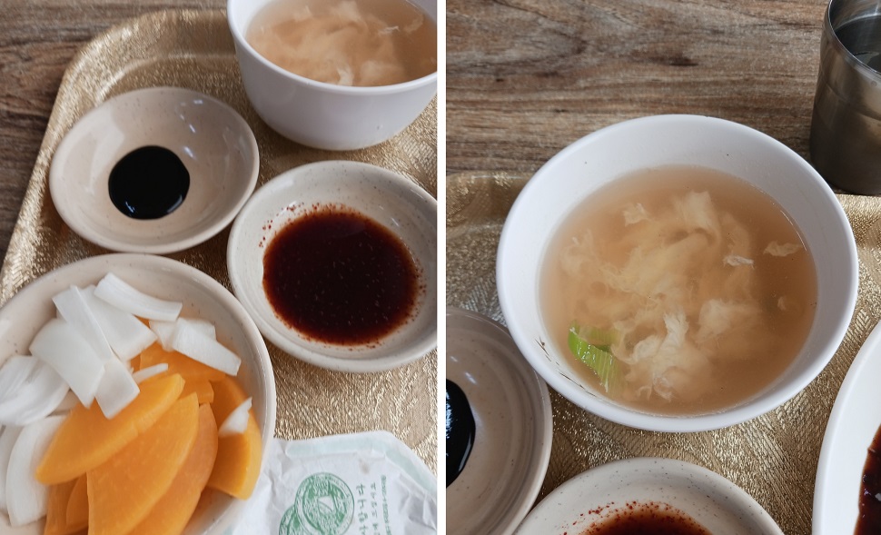 기본 구성 입니다, 계란국을 주는데 계란국주는 곳이 찐맛집이라 하지만 잘 모르겠습니다? 계란국은 그냥 소금물 + 후추 맛